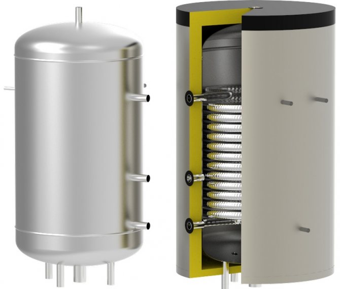 Bobina este încorporată în focar și poziționată astfel încât tubul să nu fie expus flăcării directe. Acest element trebuie să fie plasat pe calea produselor de ardere de ieșire, caz în care va servi cât mai mult timp și nu va începe să se ardă. În structurile de acest tip, apa se va încălzi suficient de repede, dar în același timp dispozitivul va începe să reducă puterea dispozitivului pentru încălzire. Dispozitivul pentru utilizare în exterior este simplu în ceea ce privește designul și accesibilitatea, dar nu este foarte ușor de întreținut și necesită reîncărcarea constantă a surselor de apă. Astfel de rezervoare sunt suspendate de părțile laterale ale focarului și încălzite de radiațiile infraroșii din acesta.