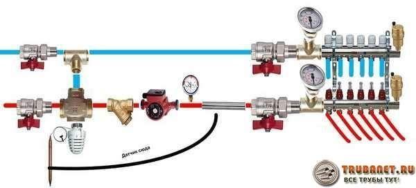 สำหรับการควบคุมโหมดความร้อนโดยอัตโนมัติจะมีการติดตั้งเครื่องผสมสามทางพร้อมเทอร์โมสตัทและเซ็นเซอร์อุณหภูมิภายนอก ระบบนี้สร้างวาล์วเทอร์โมสแตติก มีการติดตั้งที่ทางเข้าของท่อร่วม อุปกรณ์ทำจากทองเหลืองหรือสำริด