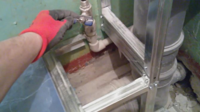 ห้องน้ำใช้ drywall สีเขียวทนความชื้น โครงติดตั้งจากโปรไฟล์โลหะพิเศษซึ่งขันสกรูบอร์ดยิปซั่ม จากนั้นพื้นผิวจะเสร็จสิ้นโดยการฉาบปูนตามด้วยการทาสีหรือกระเบื้องติดกาว ท่อแนวตั้งและแนวนอนสามารถเย็บได้ด้วยวิธีนี้