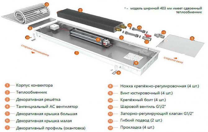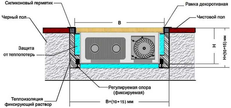 เครื่องใช้เช่นคอนเวอร์เตอร์พื้นเป็นไปตามกฎง่ายๆของฟิสิกส์ อากาศเย็นที่จมลงสู่ส่วนล่างของห้องซึมผ่านตะแกรงพิเศษไปยังองค์ประกอบความร้อนได้อย่างอิสระ ที่นั่นร้อนขึ้นและสูงขึ้นทำให้ทั้งห้องร้อนขึ้น อากาศอุ่นไหลเวียนอย่างต่อเนื่องจึงให้ความอบอุ่นคงที่ในห้อง