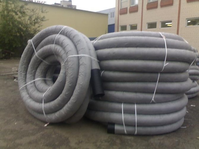 Ngayon, ang mga posibilidad ng pagpili ng mga tubo para sa aparato para sa pag-draining ng lupa at ibabaw na tubig ay pinalawak. Ang pinakamahusay na pagpipilian ay isang corrugated plastic pipe, kung saan nagawa ang mga nakahandang butas. Upang ang mga butas ay hindi tumahimik at hindi lumutang sa lupa, ginagamit ang maluwag na mga geotextile para sa proteksyon, na balot sa istraktura ng paagusan. Ang materyal na ito ay nalulugod sa isang abot-kayang presyo.
