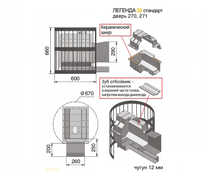 Mula sa diagram, kapansin-pansin na ang pag-aayos ng ash pan at kalan ay nanatiling pareho: ayon sa pagkakabanggit, isang drawer at isang cylindrical grid para sa paghawak ng mga bato. Ang serye ay may kasamang 5 mga linya ng mga hurno, na ang bawat isa ay dinisenyo para sa ilang mga sukat ng silid ng singaw, mula 6 m3 at nagtatapos sa dami ng 40 m3.