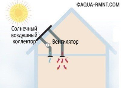 Güneş panelleri (kollektörler), binanın güney cephesine, güneş ışınlarıyla maksimum düzeyde ısınacak şekilde açılı olarak yerleştirilmiştir. Sistem otomatik modda çalışır: hava sıcaklığı ayar noktasının altına düştüğünde, hava, fanlar vasıtasıyla ısıtma modüllerinden geçirilir. Bir hava pili, sırasıyla 40 m²'ye kadar olan bir odayı ısıtmanıza izin verir, bir dizi kolektör tüm eve hizmet edebilir.